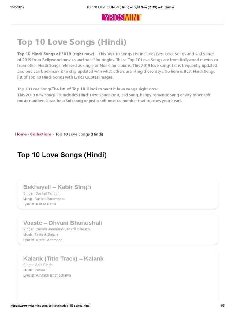 Top 10 Love Songs Hindi Right Now 2019 With Quotes Bollywood Film Production Districts