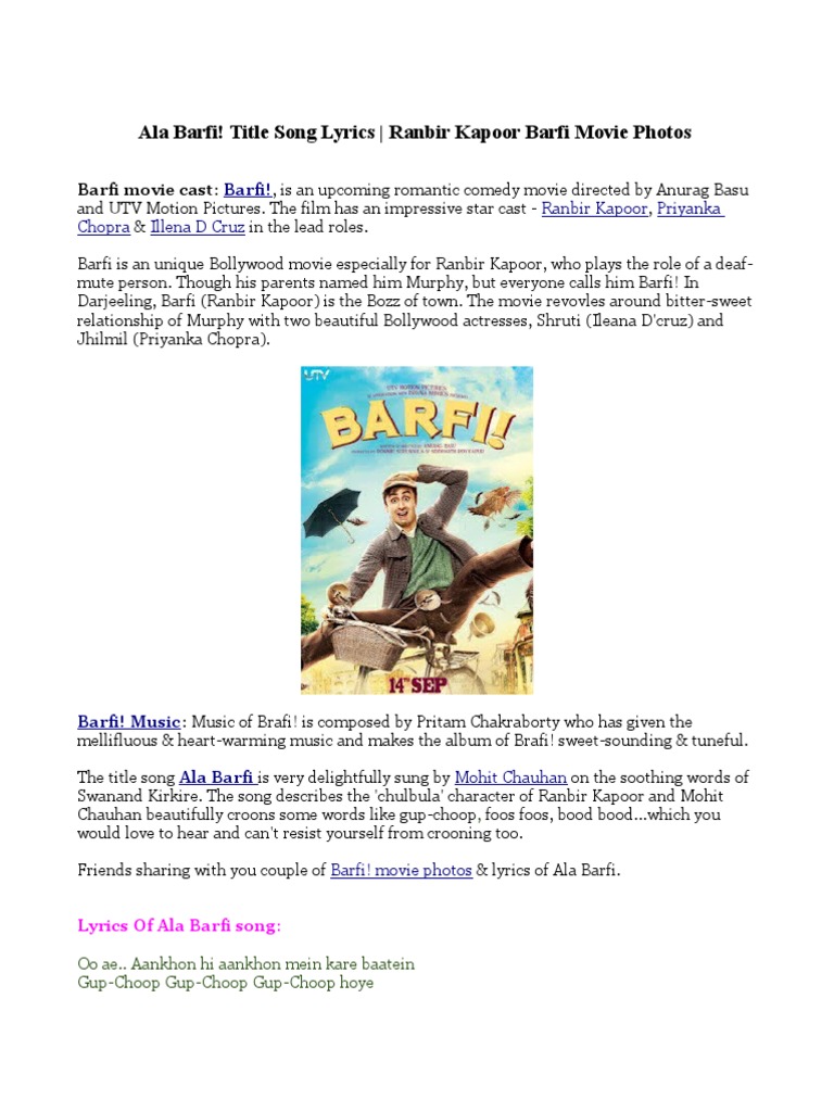 Ala Barfi Title Song Lyrics Ranbir Kapoor Barfi Movie Photos Film Production Districts Bollywood