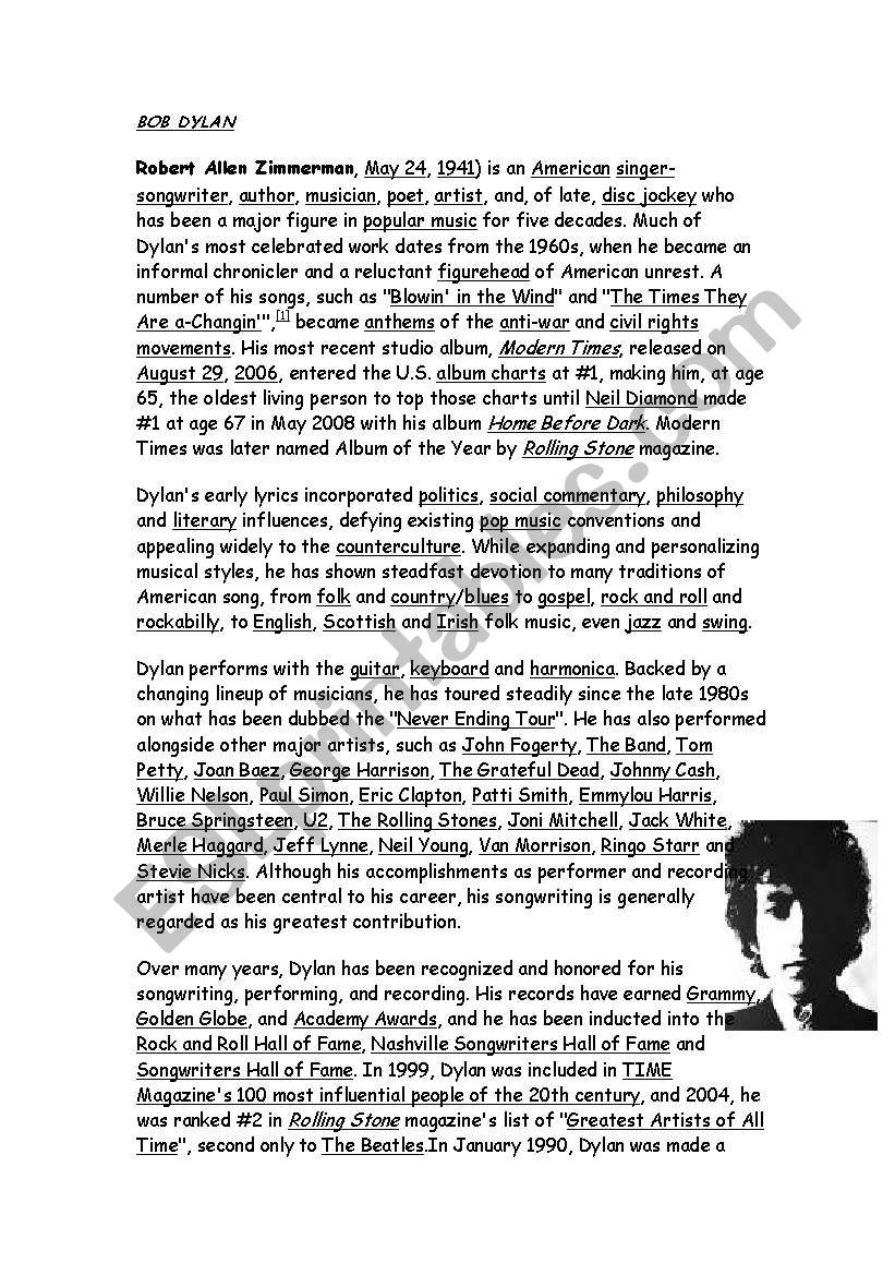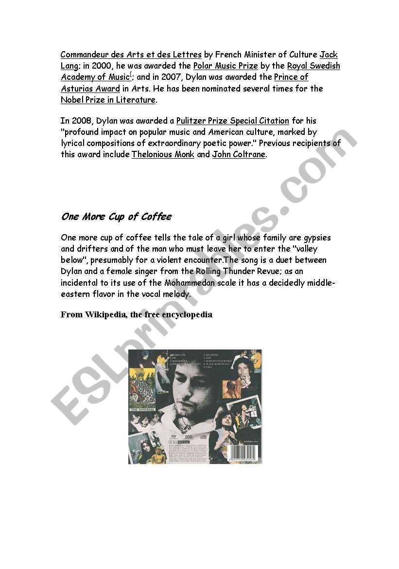 English Worksheets One More Cup Of Coffee Bob Dylan