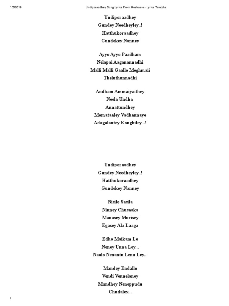 Undiporaadhey Song Lyrics From Hushaaru Lyrics Tamizha Leisure